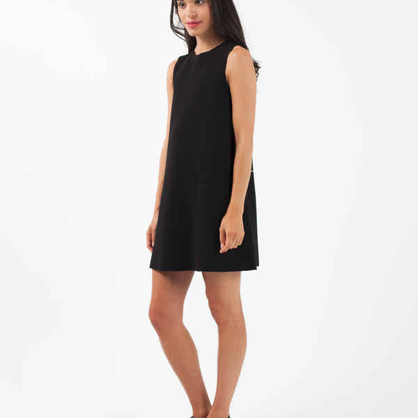 Harvey Faircloth's Sleeveless Dress is a pop from the 1960s. A waistless dress with an a-line cut is the flattering look of the season. Fully lined. Exterior zip pockets at back. Zip closure at side and shoulder. Color Black. 78% Acetate, 22% Polyester, Lining 100% Silk. Made U.S.A. Ashley is wearing a US 2.