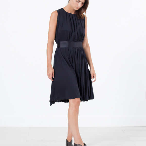 Fine pleats gather the sleeveless bodice and release the sweeping skirt of this wool dress. Silken sash ties at natural waist giving way to a back zip closure. Hache. Color Navy. 97% Wool, 100% Viscose. Lana is wearing an Italian 40.