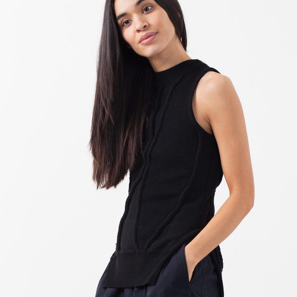 The 2015 line embodies Sayaka Davis' artistic vision with effortless composure to every piece. This Knit Tank screams BritPop and the 1960s. Reinvented for the now, braided vertical stripes and silhouette combines for modern chic. Asymmetrical hemline. Color Black. 100% Cotton. Made in U.S.A. Ashley is wearing an X-Small.