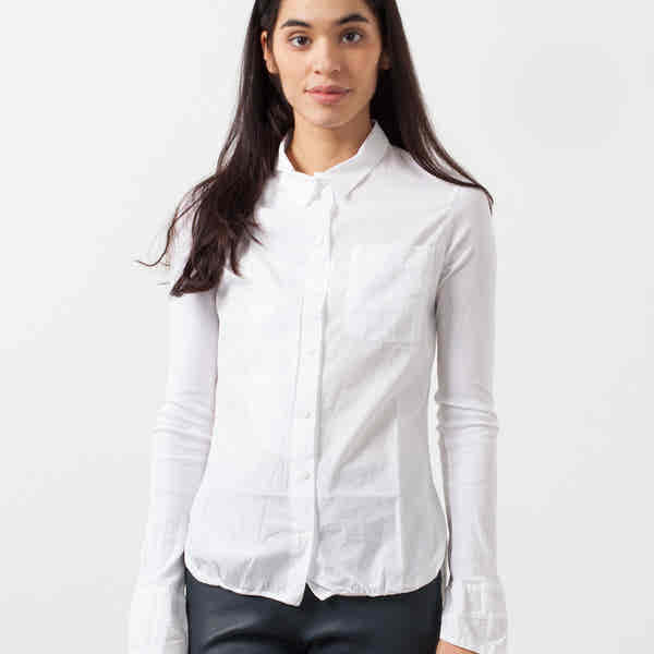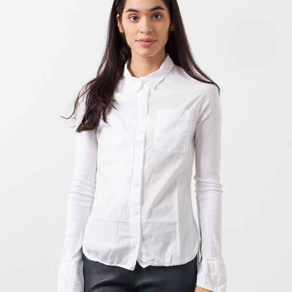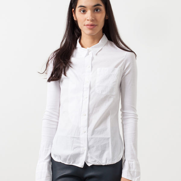 The Soft Sleeve Button Up offers just enough stretch for comfort and shape. Never worry about tightness or pulling in the shoulders because with this contrasting sleeve there is room to move. Kristensen du Nord. Color White. 96% Cotton, 4% Elastane, Sleeves 100% Cotton. Made in Italy. Ashley is wearing a Size 1.