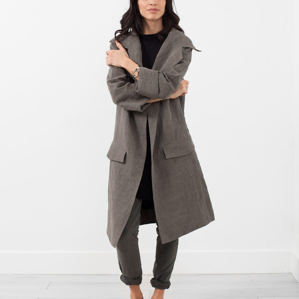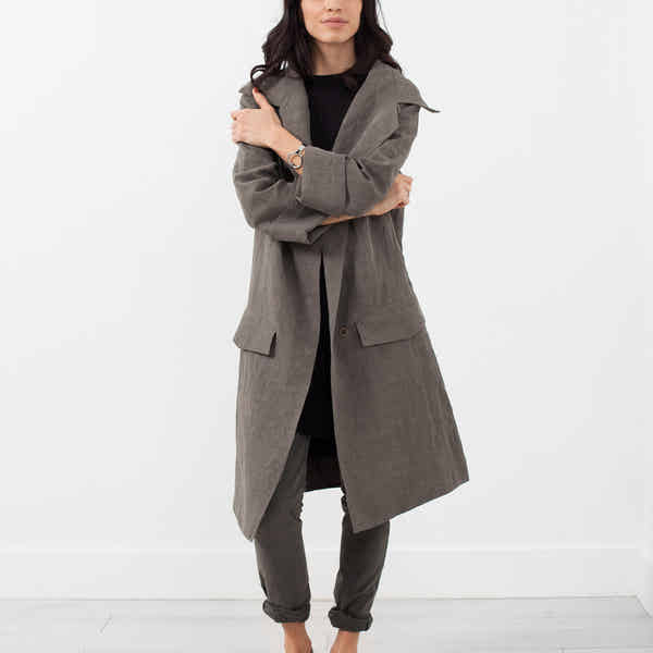 The Sola Coat offer traveler's perfection with intentional wrinkling and versatility. Snap button closure at front. Covered flap pockets at front. Adjustable back belt at waist. Fully lined. Annette Gortz. Color Mud. 100% Linen, Lining 100% Cotton. Made in the EU. Ashley is wearing a Small.