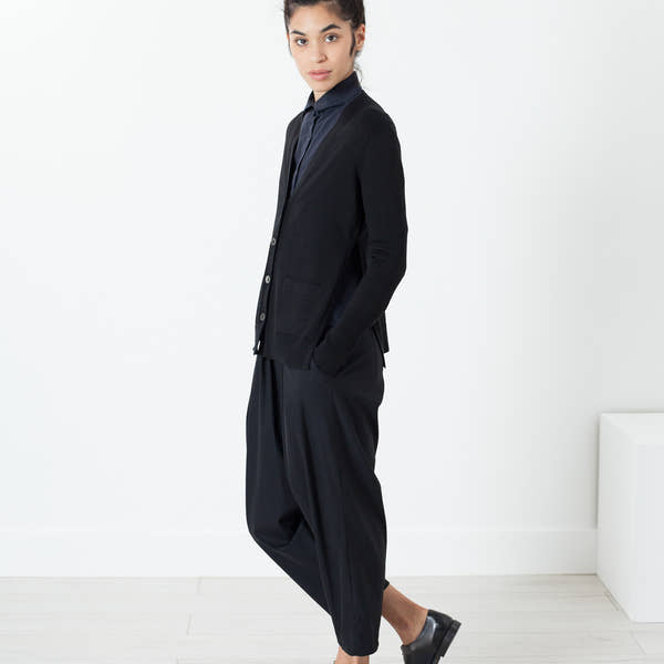 As the name implies it is a square knit cardigan with high side vents creating movement when you move. Understated through and through the long rib knit cuffs can be rolled up and beautiful mother of pearl buttons add a hint of luxury. Fantastic inset pockets at the hip are barely noticeable staying close to the body of the knit. Sibel Saral. Color Black. 85% Cotton, 15% Cashmere. Ashley is wearing an X-Small.