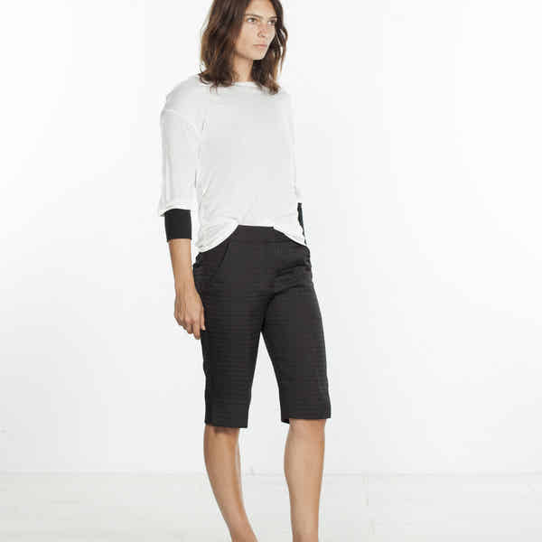Contemporary is quilted shorts in timeless black. Side vents allow for easy movement. Flat front waist with zip and hook-and-eye closure. Harvey Faircloth. Color Black. 51% Cotton, 49% Silk. Lining 100% Silk. Made in U.S.A.  Lana is wearing a size Small.