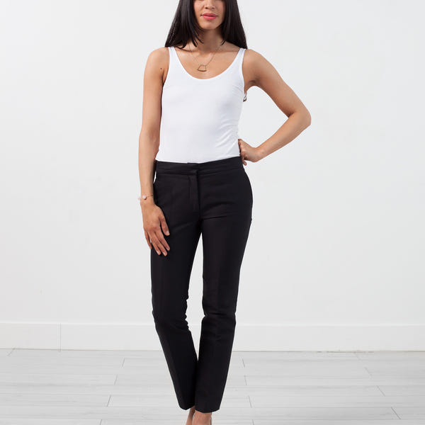 This structured trouser offers a straight leg for a lasting fit. With a touch of silk, this piece presents an irresistible luxe. Front zip fly with skirt hook and eye closure. Front side, and back pockets. Fully-finished. Ter et Bantine. Color Black. 92% Cotton, 8% Silk, 100% Cotton. Made in Italy. Ashley is wearing an Italian 40.