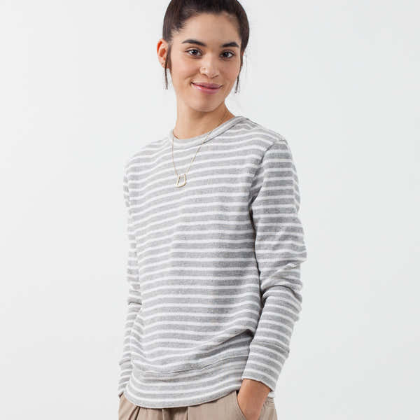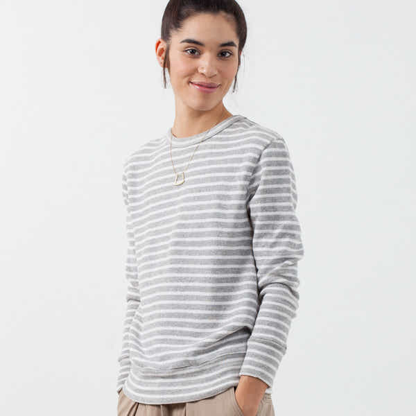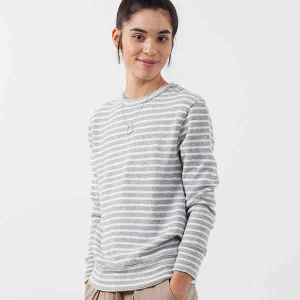 Authenticity prevails at the New York based line, V:Room. The Striped Pullover presents a terry comfort of beachwear for the everyday. Crew neckline. Color Grey/White. 100% Cotton. Made in Japan. Ashley is wearing an X-Small.