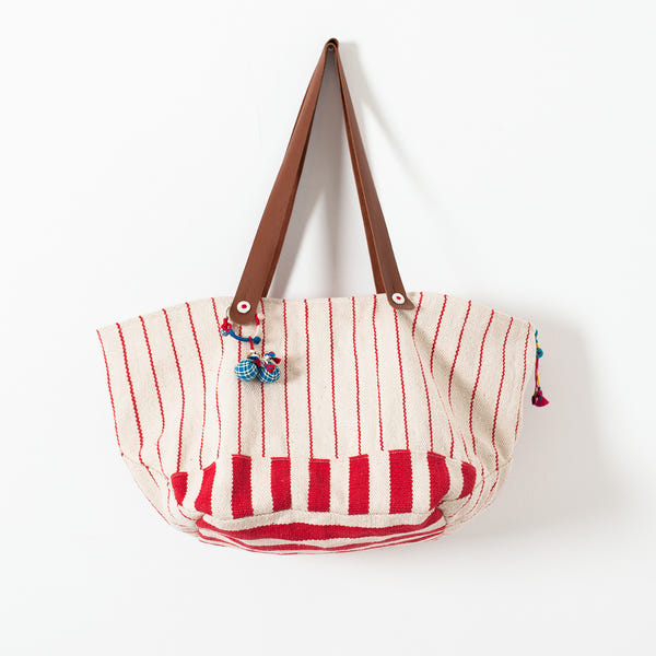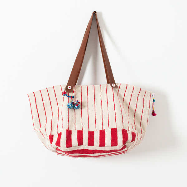 Comfy, yet cool. Textiles from Péro are seasonless while remaining modern. Experts in the handmade, péro's woven patterns demonstrate excellence in art. The Woven Oversized Tote is your instant beach companion. With two interior pockets with single button closures, this piece presents optimal use and function. Removable straps. Fully lined. Color Red. 100% Cotton, 100% Leather straps. Made in India.