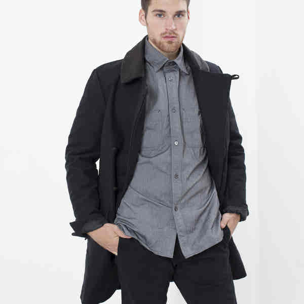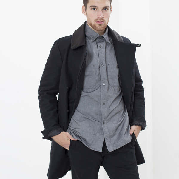 A sheath of durable cotton fabric, the Taban Coat is worked into a military look with two front patch pockets, vertical welted pockets and a double breasted button closure. Leather detailing is seen throughout the coat. Back vent at hem. Hannes Roether. Color Black. 100% Cotton, 100% Lamb Leather. Spencer is wearing a size Large.