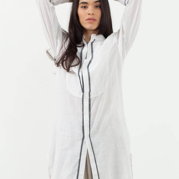 The Tranjore combines the beauty of a button up and tunic shirt. Fantastic length offers coverage and depth to wear. Mandarin collar. Covered and exposed button placket closure at front. Khadi & Co. Color White. 100% Cotton. Made in India. Ashley is wearing a Small.
