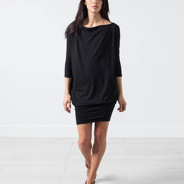 German designed with a minimal palette, Alexandra Schiess should be a designer on your radar. 3/4 sleeves, wide neckline, and a tapering hem all combined represent the beautiful intellect that is the Tapered Boat Neck Dress. Jersey knit for ease and comfort, this is the "anywhere" piece. Color Black. 94% Viscose, 6% Elastane. Made in Germany. Ashley is wearing an Extra-Small.