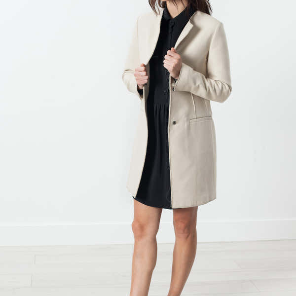 A sleek and sensible collarless coat from Ter et Bantine in a luxurious premium cotton twill that feels more like an easy denim. Raw edges at center front hide hand-sewn snaps. Center back vent and a small vent at each sleeve. Color Cream. 100% Cotton. Lana is wearing the Size 42.