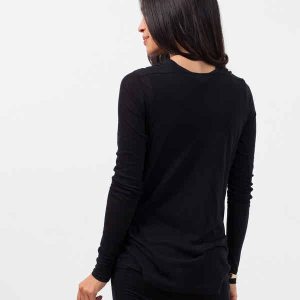The Tetra Top is perfected for any summer long-sleeve requirements. Layering is optional with its lightweight, barely sheer body. Gathered details at left seam. Uniquely structured neckline. Drifter. Color Black. 100% Pima Cotton. Made in the U.S.A.