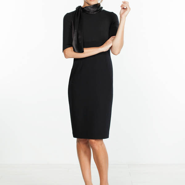 A softly draped silk tie sweeps across the neckline of this sleeve, knee length sheath dress. Empire waist line. Amelia Toro. Color Black. 100% Wool, Collar 100% Silk. Made in Columbia. Lana is wearing a size 4.