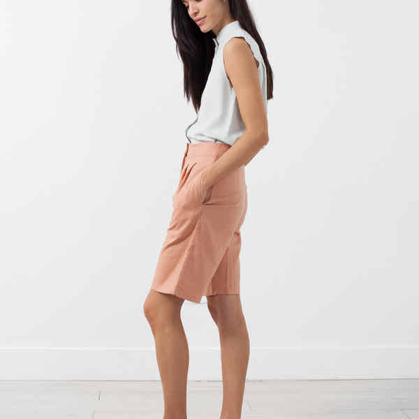 The Trail Short is perfect for all types of travel. Front pleats. Hook and eye with zip closure at front. Side angled pockets at front. Jesse Kamm. Color Brick. 45% Tencel, 40% Cotton, 15% Flax. Made in U.S.A. Ashley is wearing a Small.