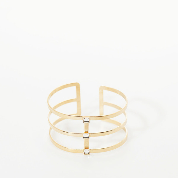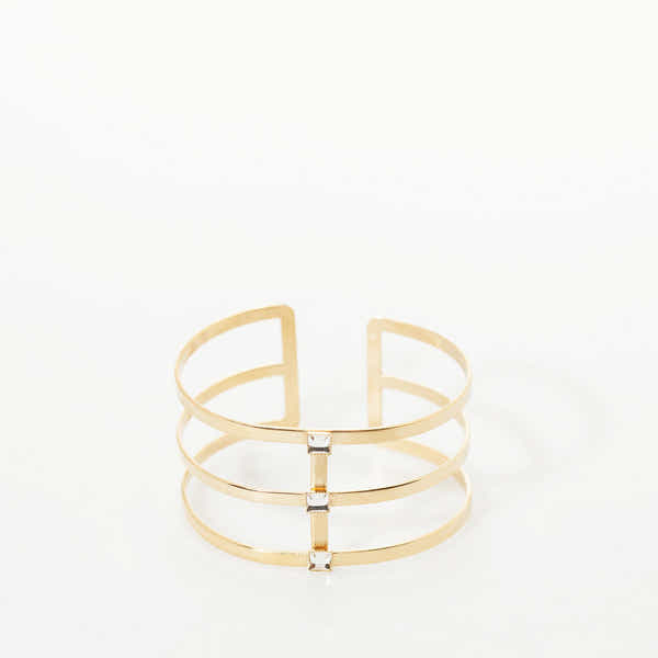 This gold and brass cuff is composed of 3 architectural three tiers, each bearing its small clear stone. 5 Octobre. Color Gold Brass. Length 6", 1.5" Wide.