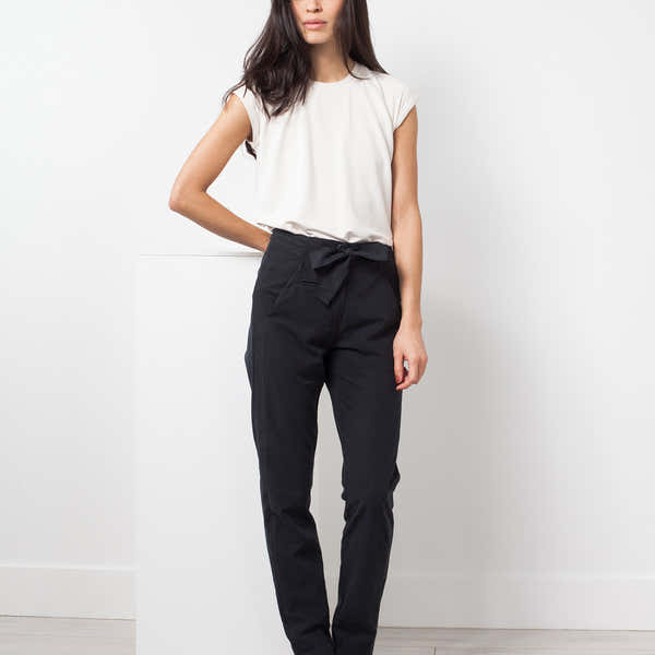 The straight silhouette and loose waistline offers a boyfriend fit in the Troupy Pant. Waist tie. Front zip fly. Front angled pockets with coin pocket and back pockets. Hannes Roether. Color Black. 75% Silk, 25% Cotton. Made in the EU. Ashley is wearing an X Small.