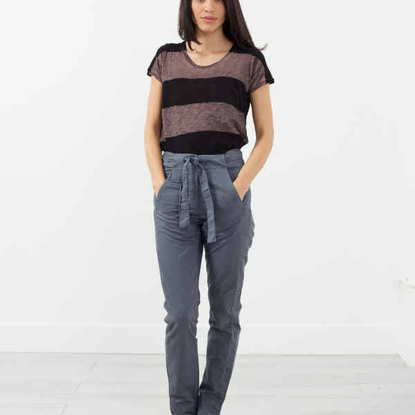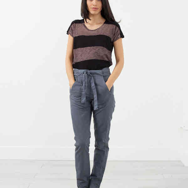 The straight silhouette and loose waistline offers a boyfriend fit in the Troupy Pant. Waist tie. Front zip fly. Front angled pockets with coin pocket and back pockets. Hannes Roether. Color Space. 75% Silk, 25% Cotton. Made in the EU. Ashley is wearing an X Small.
