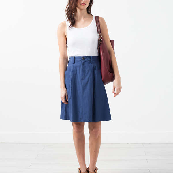The Trumpet Skirt is a classic A-line shape to the knee, and flatters the body. Two bucket pockets around sides. Single button closure with zip fly at front. Elastic in back waistband for optimal fit. Lined. Nicholson & Nicholson. Color Blue. 100% Cotton. Made in Japan. Lana is wearing a French 36.