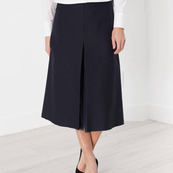 Timeless and inventive, Manuela Arcari’s designs for Ter et Bantine are exquisitely minimalistic while including touches of femininity. A-line skirt with subtle paneling. Back darts add to clean silhouette. Zip closure in back. Color Navy. 63% Cotton, 21% Polyester, 16% Seta. Made in Italy. Lana is wearing a Size 38.