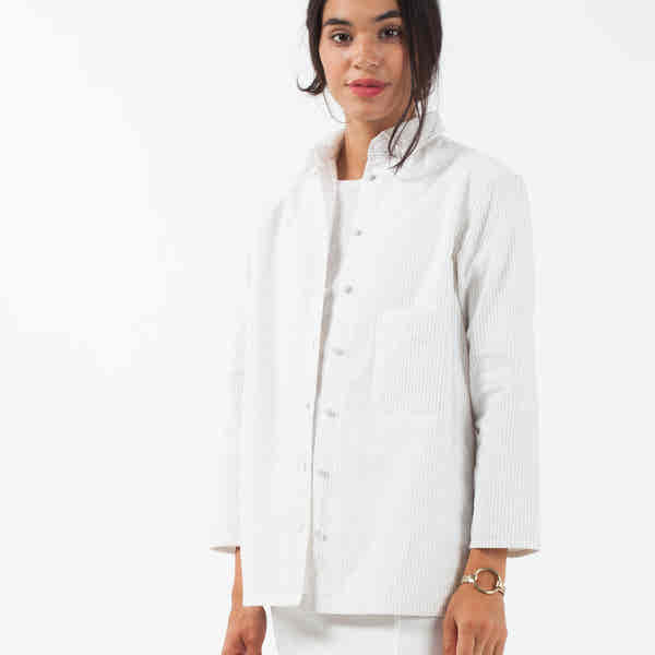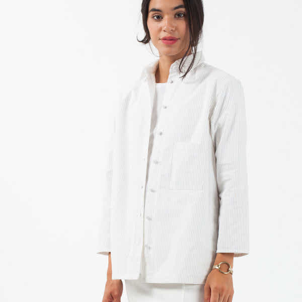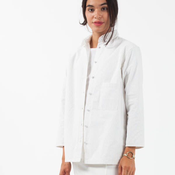 The Oxford from Harvey Faircloth adds a dash of class to a pair of jeans and those favorite flats. Covered button placket at front. Front breast pocket. Bracelet length sleeves. Fully lined. 100% Cotton. Made in U.S.A. Ashley is wearing a US 2.