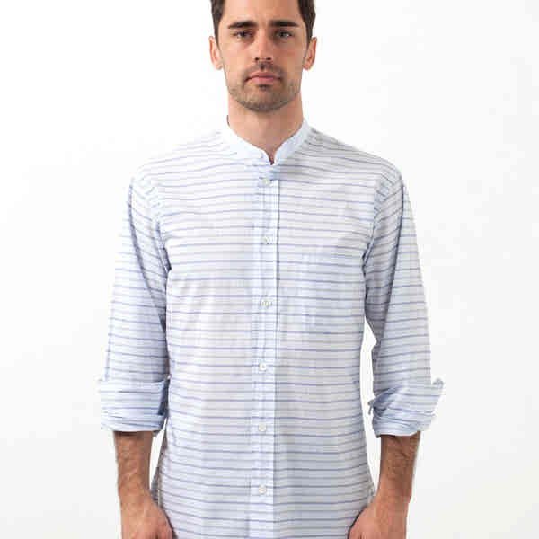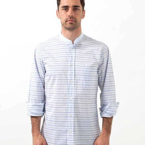 The Tunic Shirt presents a slim to natural fit with a mandarin collar. Breast pocket at front left. Button placket closure at center front. Nigel Cabourn. Color Blue Stripe. 100% Cotton. Made in the EU. Addis is wearing a Size 50.