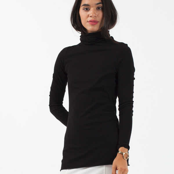 This Turtleneck from Organic by John Patrick is a fitted piece with layering potential. Light and easy, this slim piece sets the standard for long-sleeves everywhere. Layering collar. Raw hemming. 100% Organic Cotton. Made in Peru. Ashley is wearing an X-Small.