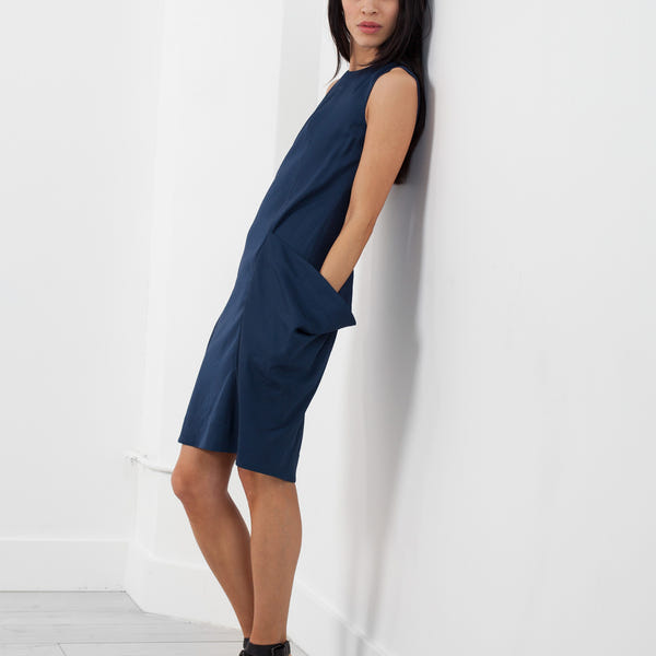 The Uti offers a slim to natural silhouette with structural seaming details. Large accent pockets at side. Zip closure at center back neck. Schai. Color Indigo. 98% Viscose, 2% Elastane. Made in U.S.A. Ashley is wearing an X-Small.