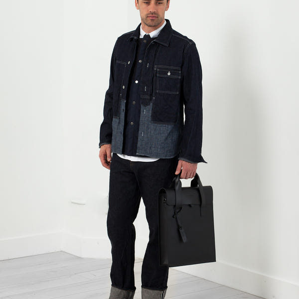 The Utility Jacket is a sturdy layering piece with the versatility to be worn independently, or as outerwear. Button placket closure at front. Pocket detail at front. Nigel Cabourn. Color Indigo. 100% Cotton. Made in Japan. Jacob is wearing a 50.
