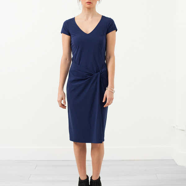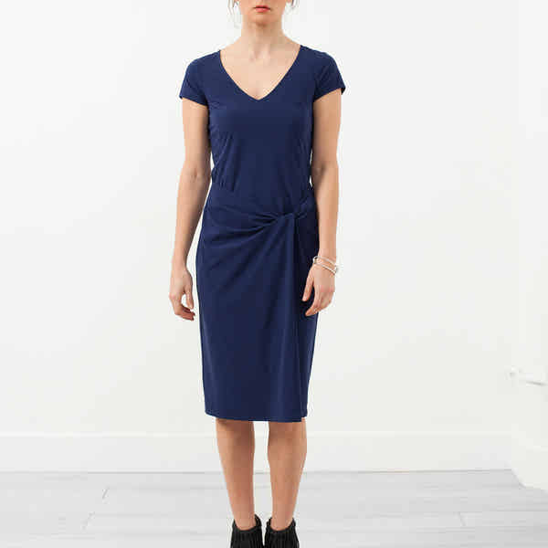 The Twist Dress offers the ever-flattering princess seaming in perfected stretch material. Soft V-neckline is delicately feminine. Capped sleeves. Hovman. Color Blue. 80% Polyamide, 20% Elastane. Lana is wearing a German 34.