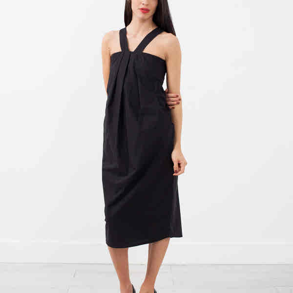 The V-Strap Dress is a flattering look as a pleated, shift dress. V-neckline. Invisible zip closure at side. Side angled pockets at front. Hache. Color Black. 96% Cotton, 4% Elastane. Made in Italy. Ashley is wearing a Size 40.