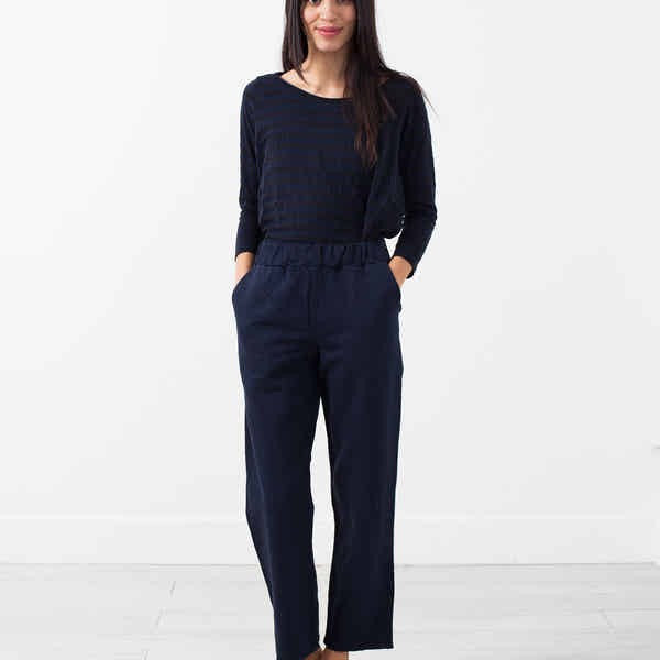 The Varazze Trouser offers a wide fit with a tapered leg. Elastic waistband for ease. Side angled pockets. One exterior pocket at right back. Labo.Art. Color Atlantic. 100% Cotton. Made in Italy. Ashley is wearing a Size 0.