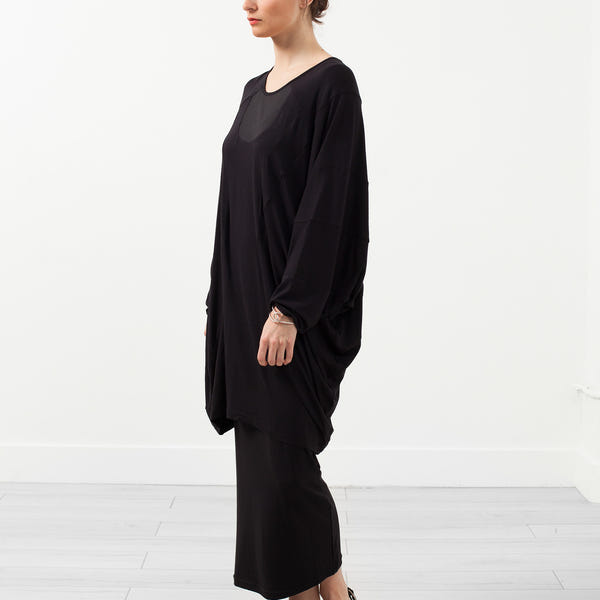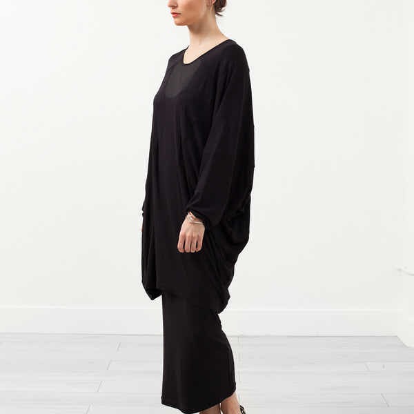 Bridging oversized with polished is a balancing act, the Grundahl's Vibe represents the perfected algorithm. Dolman sleeves. Ivan Grundahl. Color Black. 96% Viscose, 4% Elastane, Trimming 100% Cotton. Made in the EU. Lana is wearing a Small.