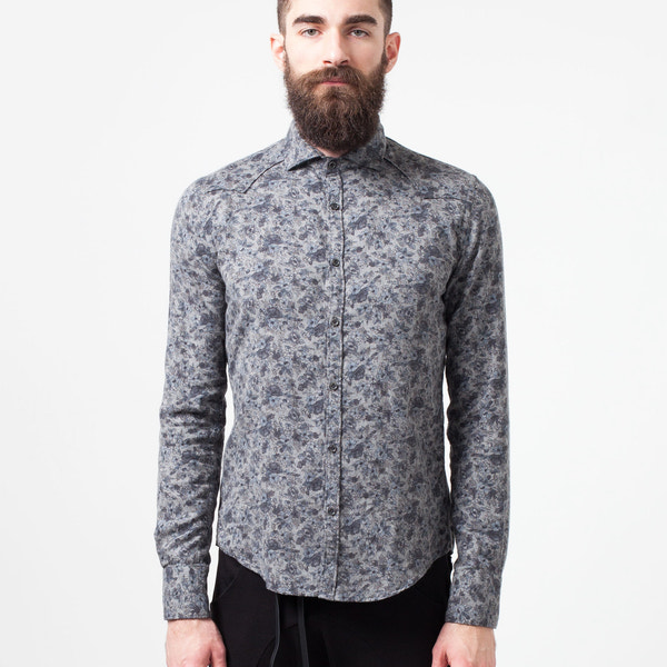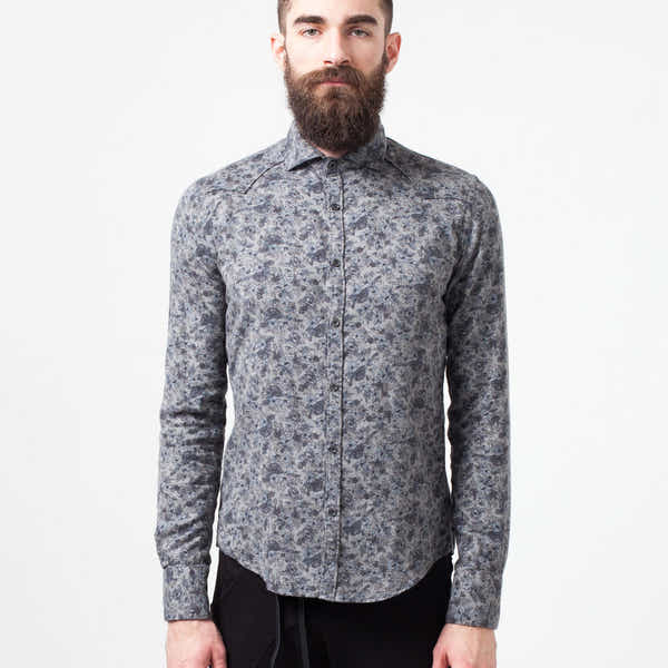 A Western style shirt gets a sweet touch with an all over floral motif. Two flap pockets at the chest and a classic western style yoke finishes the back. Aglini. Color Dark Hash Floral. 100% Cotton. Made in Italy. Addis is wearing a 40.