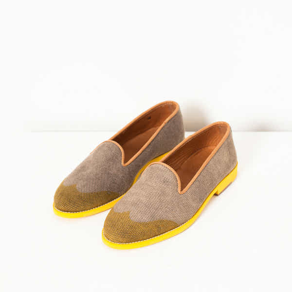 Not your Grandfather’s house shoes. These Loafers from Verba are classic in silhouette, yet contemporary with a canvas body and neon soles. Leather trim. Color Yellow. Made in Italy.