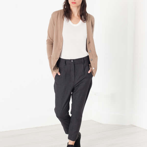 Sibel Saral's staple pants encourage comfort and undeniable chic. Wide, trouser leg fit. Side angled pockets, front zip fly closure. Back pocket. Color Black. 85% Wool, 15% Elastane. Made in Turkey. Lana is wearing an Extra-Small.