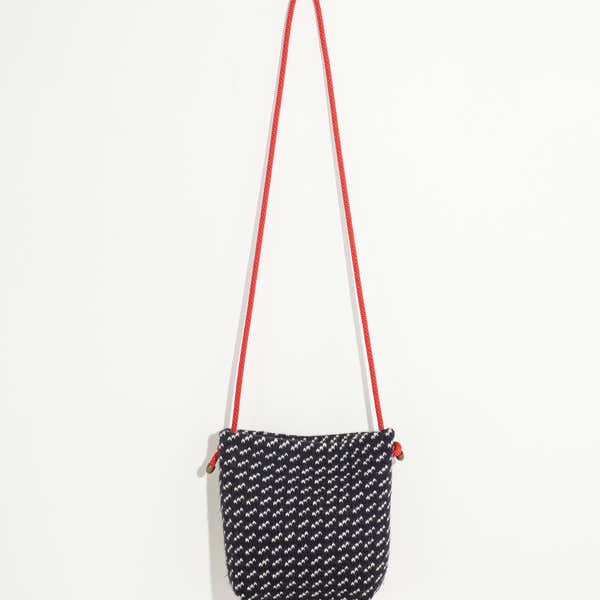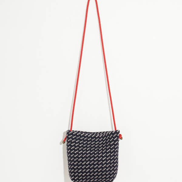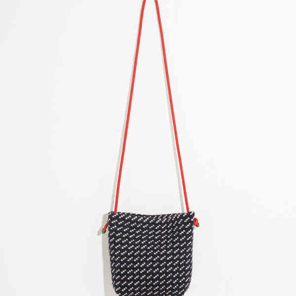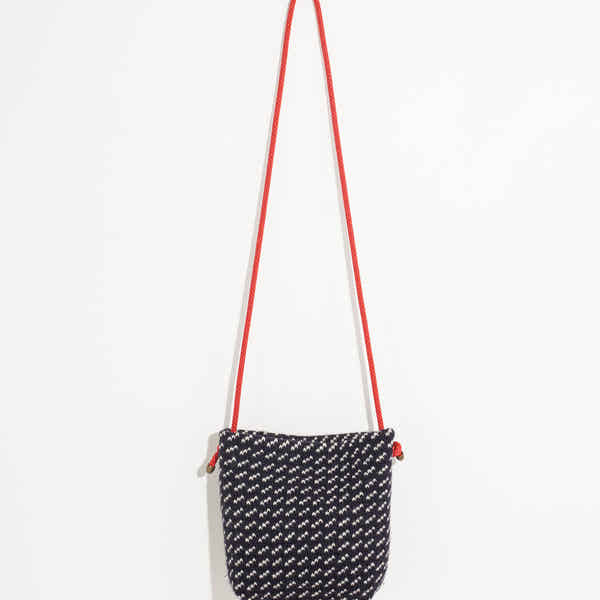 A mini wool cross-body pouch with a red corded strap looped through metal grommets lends a conveniently laid back style. An inner pocket and covered button and loop closure complete this casual hip accessory. Color Black/White. 80% Wool, 20% Rayon, Lining 65% Acetate, 29% Polyamide. Made in U.S.A.