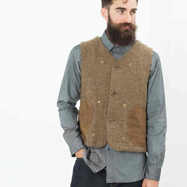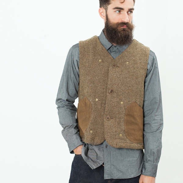 A herringbone tweed in a winter-weight wool the rugged Work Vest from Nigel Cabourn can be worn underneath the Aircraft jacket or alone. If worn with the Aircraft Jacket it will snap in at center front as a liner. Either way it's worn it will find years of use with the reinforced snaps and waxed cotton pockets. Two patch pockets in front and two in back. Color Tan. 100% Wool, 100% Cotton. Addis is wearing an Italian 50. Addis is 6’2”, Chest 38.5”, Waist 31”, Inseam 32”.