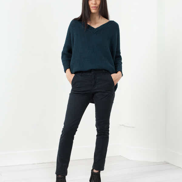 Created because of a need for function without compromising aesthetic, 1.61 offers heirloom apparel. Androgynous in nature, 1.61 garments are made for both men and women. The Woven Pant offers the comfort of cotton and shaping of raw denim. Hook and eye closure with zip fly. Side angled pockets. Color Navy. 100% Cotton. Made in U.S.A. Ashley is wearing a Size 25.