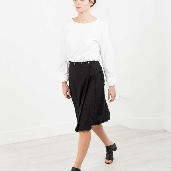 The Wrap Snap Skirt by Pip-Squeak Chapeau has a slight flare through the knee. With raw seams and hems, this wrapped skirt is versatile, light, and unfussy. Snap button at front waistband with back detail pockets. Color Black. 100% Linen. Made in U.S.A. One Size.