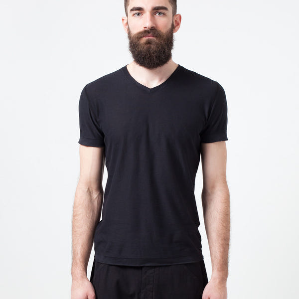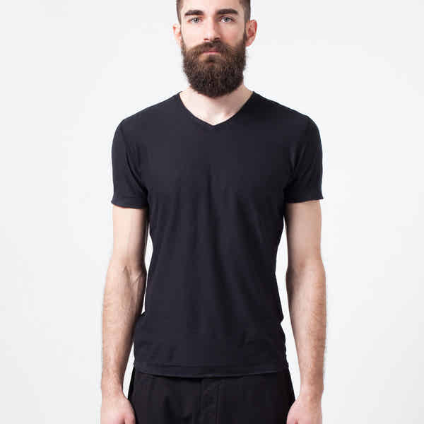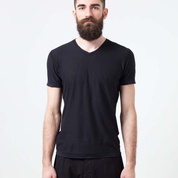 Classic T-shirt with undeniable comfort for impeccable style. V-neckline. Hannes Roether. Color Black. 100% Cotton. Made in Portugal. Addis is wearing a Medium.