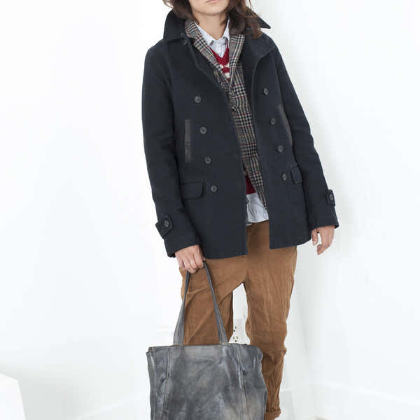 Double-breasted buttons, leather elbow patches and banded cuffs offer a mannish take on this coat by Hannes Roether. A leather under collar leads to angled welt pockets as well as a pair of patch pockets. Vented at back hem for movement. Color Black. 54% Viscose, 45% Polyester, 100% Fur Lining.